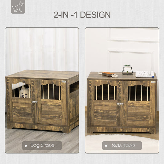 PawHut Wooden Dog Kennel, End Table Furniture with Lockable Doors, Small Size Pet Crate Indoor Animal Cage, Brown