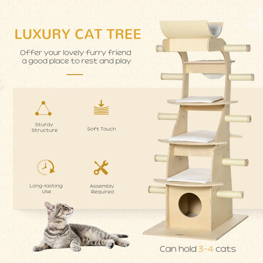 PawHut 63" Cat Tree Kitty Activity Center Wooden Cat Climbing Toy Pet Furniture with Multiple Perches Cat Condo Cushions Sisal Scratching Post, Beige
