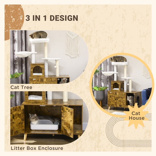 PawHut Cat Tree with Litter Box Enclosure, 2-in-1 Cat Tower Litter Box Furniture Indoor, Cat Condo with Hammock, Scratching Posts Pad, Rustic Brown