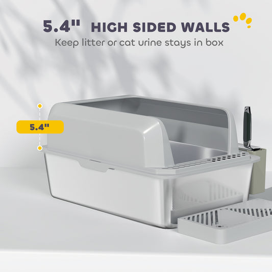 PawHut High Sided Stainless Steel Litter Box with Metal Scoop & Scoop Holder, for Easy Clean& Anti-Urine Leakage, Light Gray