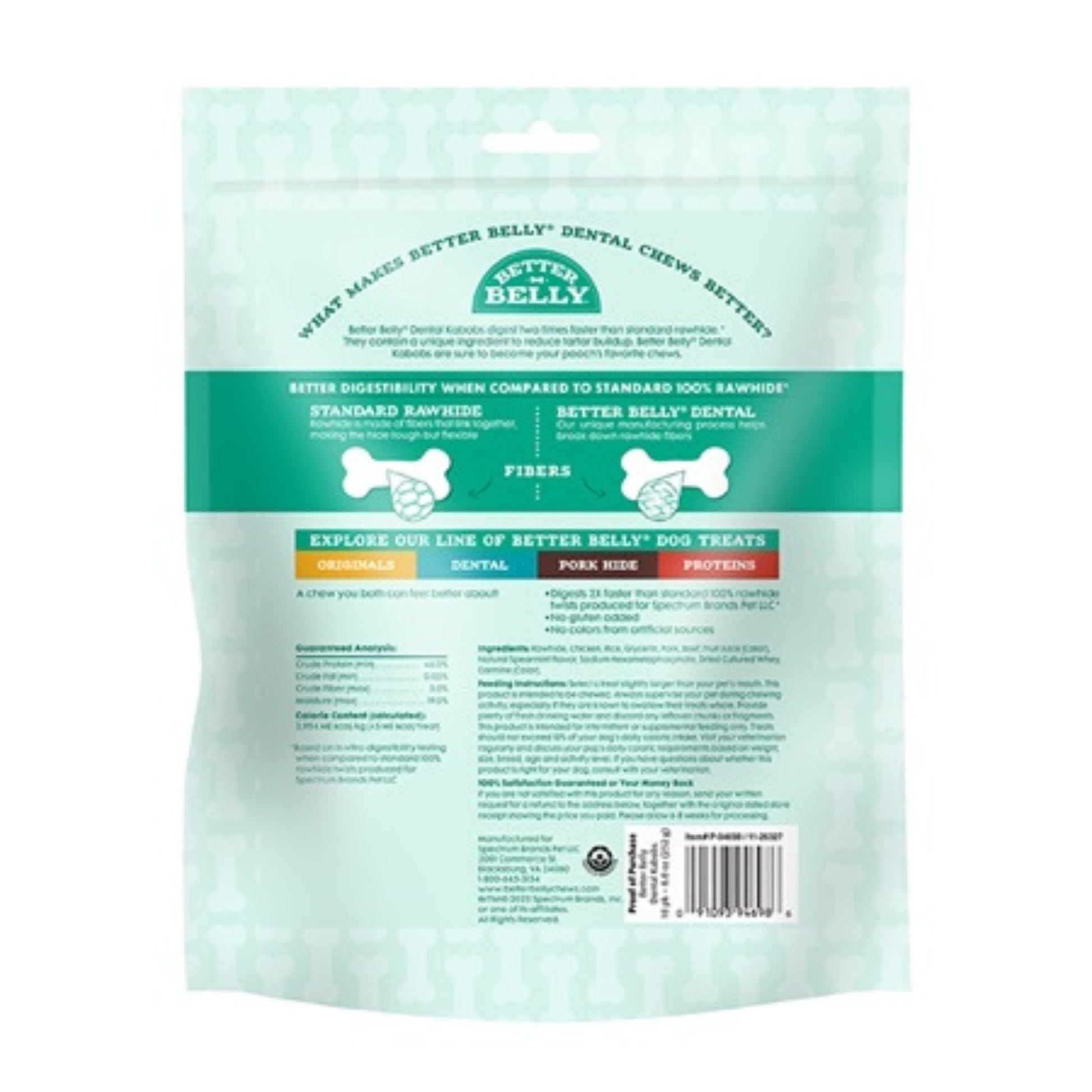 Better Belly Dental Kabobs with chicken and spearmint flavor give your pup a chew that tastes great and helps maintain healthy teeth. These dental chews are made with spearmint to freshen breath and a unique ingredient to help reduce tartar buildup. Plus, Better Belly Dental Kabobs digest two times faster than standard rawhide* and are made with no gluten added and no colors from artificial sources for a chew you both can feel better about. Standard rawhide is made of fibers that link together, making the hide tough but flexible. Our unique manufacturing process helps break down rawhide fibers. Always supervise your pet during chewing activity, provide plenty of fresh water and discard any leftover chunks or fragments. This product is intended for intermittent or supplemental feeding only.