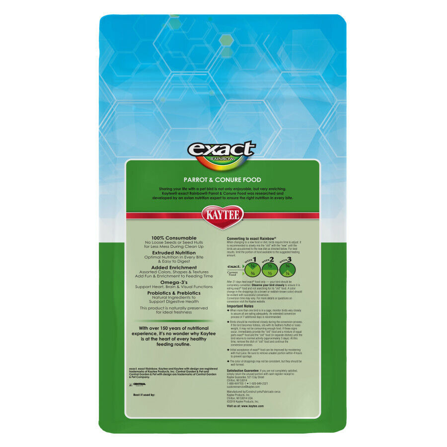 As a loving bird parent, you want to know you're choosing the best for your sweet, feathered friend. Kaytee Exact Rainbow Parrot and Conure food is developed by avian experts to promote your bird's plumage, attitude, and overall health. Your social, inquisitive pet will love eating the tasty, rainbow-colored mix, and you'll feel confident knowing each bite delivers the exact nutrition your pet needs. Kaytee Exact Rainbow Parrot and Conure food is designed with Omega 3s to support brain and heart health, prebiotics and probiotics for digestive health, and all the vitamins and minerals your bird needs. Each bag's fun shapes and colors will captivate your bird, encouraging his natural foraging instincts. In fact, he'll have so much fun at mealtime that he'll have no idea how healthy those little rainbow pieces are! Kaytee Exact Rainbow Parrot and Conure food is formulated for all Parrots and Conures, like Macaws, Cockatoos, African Greys, Amazons, Conures, Eclectus, Pionus, and large Parakeets.