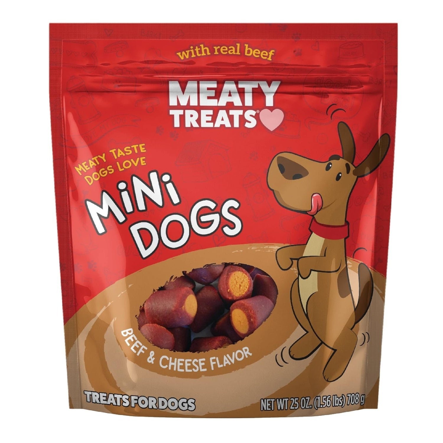 Give your barking bestie a treat he’ll crave with Meaty Treats Mini Dogs Beef & Cheese Flavor Soft & Chewy Dog Treats! These chewy treats are made with real beef and cheese for a healthy snack alternative. They’re designed to help your paw-some pal exercise his jaws all while keeping him pleasantly entertained. Use as a paw-fect between-meal snack or anytime you want to reward your paw-some pal!
