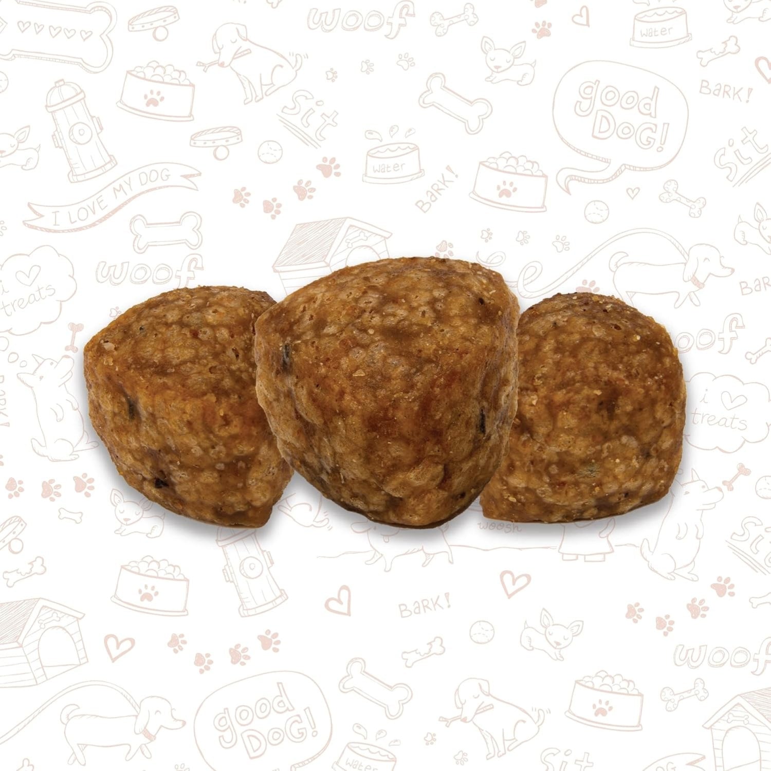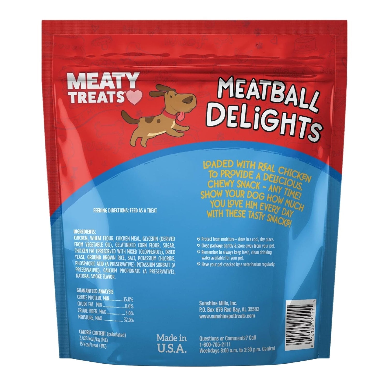 Meaty Treats Meatball Delights Chicken Flavored Meatballs are a delightful, in between meal snack that your dog will love. Because we care about the quality of our pet treats, we chose to use real chicken in this unique formulation. This tasty snack has an eye appealing meatball shape and chewy texture that will entice your dog to want more. Plus, the chicken flavor creates a mouth watering aroma that your dog will find irresistible. By choosing to feed your best friend Meaty Treats Meatball Delights Chicken Flavored Meatballs, you are choosing a bright future for your pet!