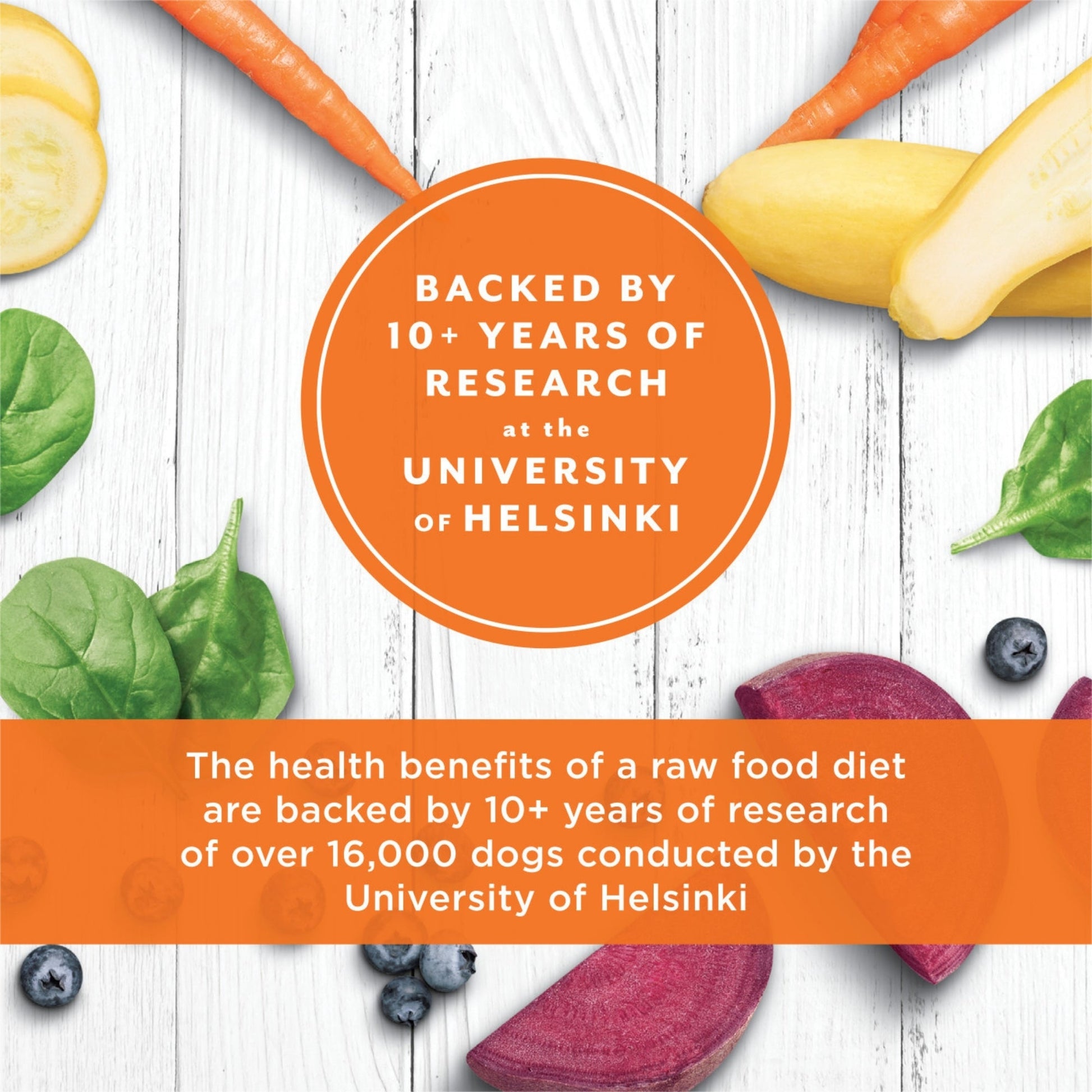 Responsibly sourced meat, non-GMO fruits and vegetables plus other wholesome ingredients in a complete & balanced raw meal