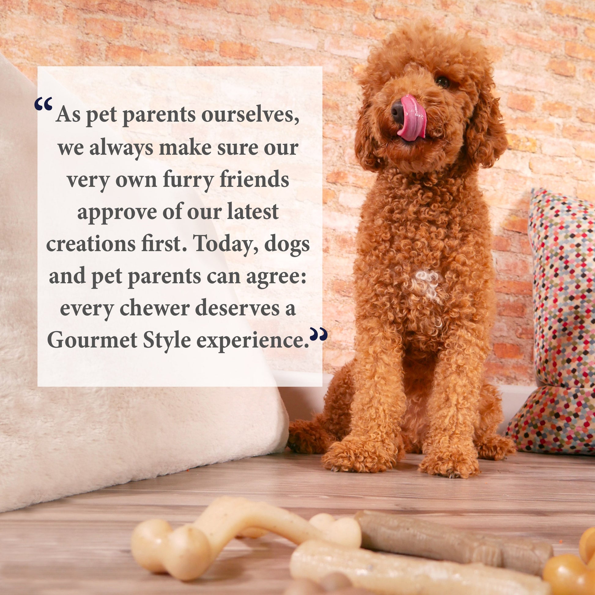 Inspired by that distinct this is the life feeling of satisfaction, Nylabones Gourmet Style chew toys are made to wow flavor obsessed dogs who crave a new type of chewing experience. Applying decades of expertise, this latest formula is uniquely crafted with enticing flavor bits you can seeleaving even the most particular pups with a sense of chewing gratification! Satisfy your furry friend's natural chewing instincts with these veterinarian recommended chew toys for dogs that are proudly made in the USA.