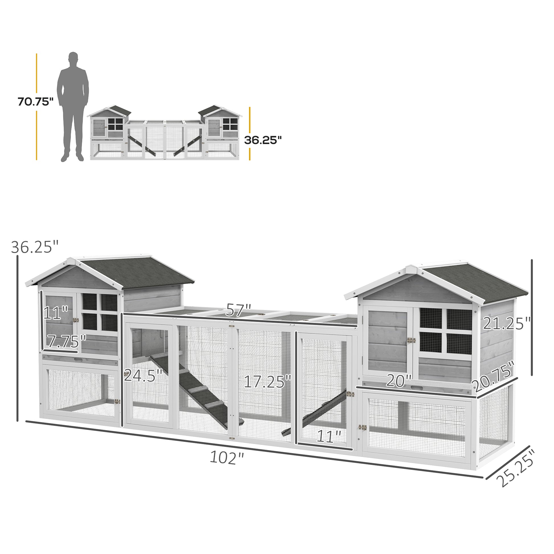 PawHut 102" 2 in 1 Wooden Rabbit Hutch, Double Main House Pet Playpen, Large Bunny House Enclosure for Indoor/Outdoor with 2 Run Boxes, No Leak Tray, and Ramp, for Guinea Pig and Small Animals, Gray