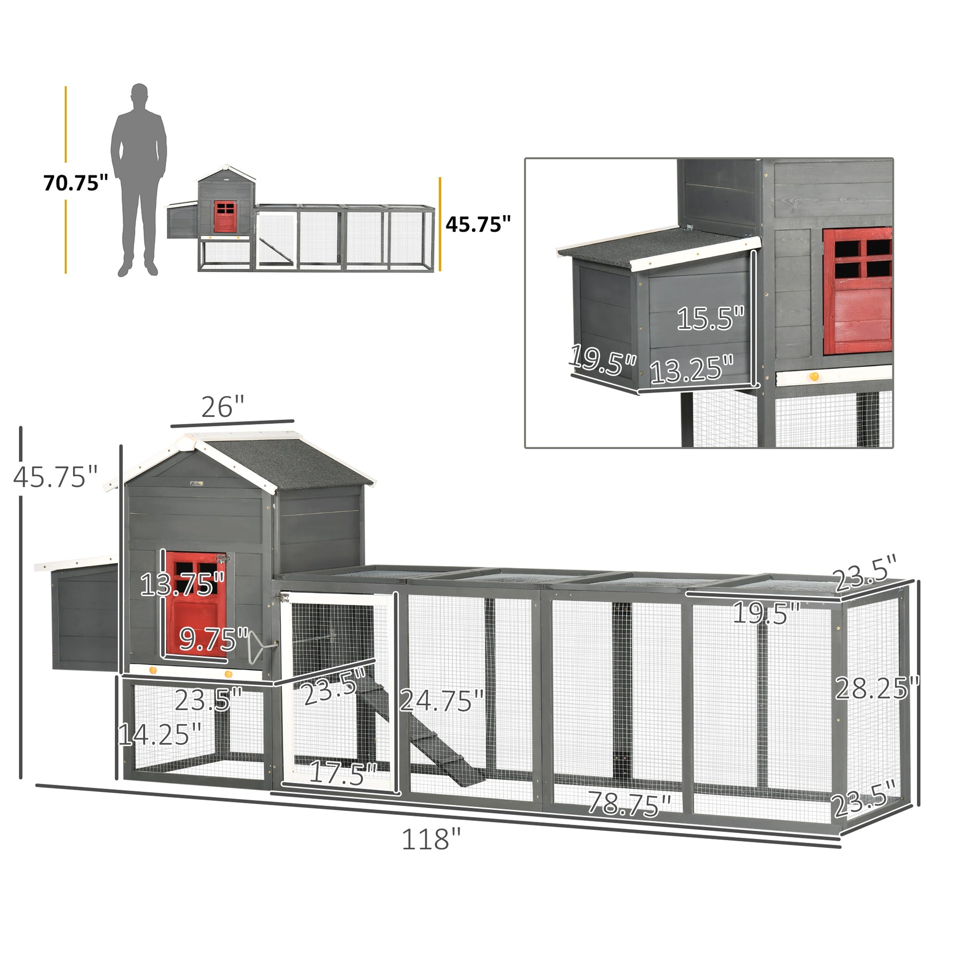 PawHut 118" Extra Large Chicken Coop with Asphalt Roof, Wooden Hen Run with Slide-Out Tray and Nesting Box, Chicken Hutch for 3-6 Chickens, Gray