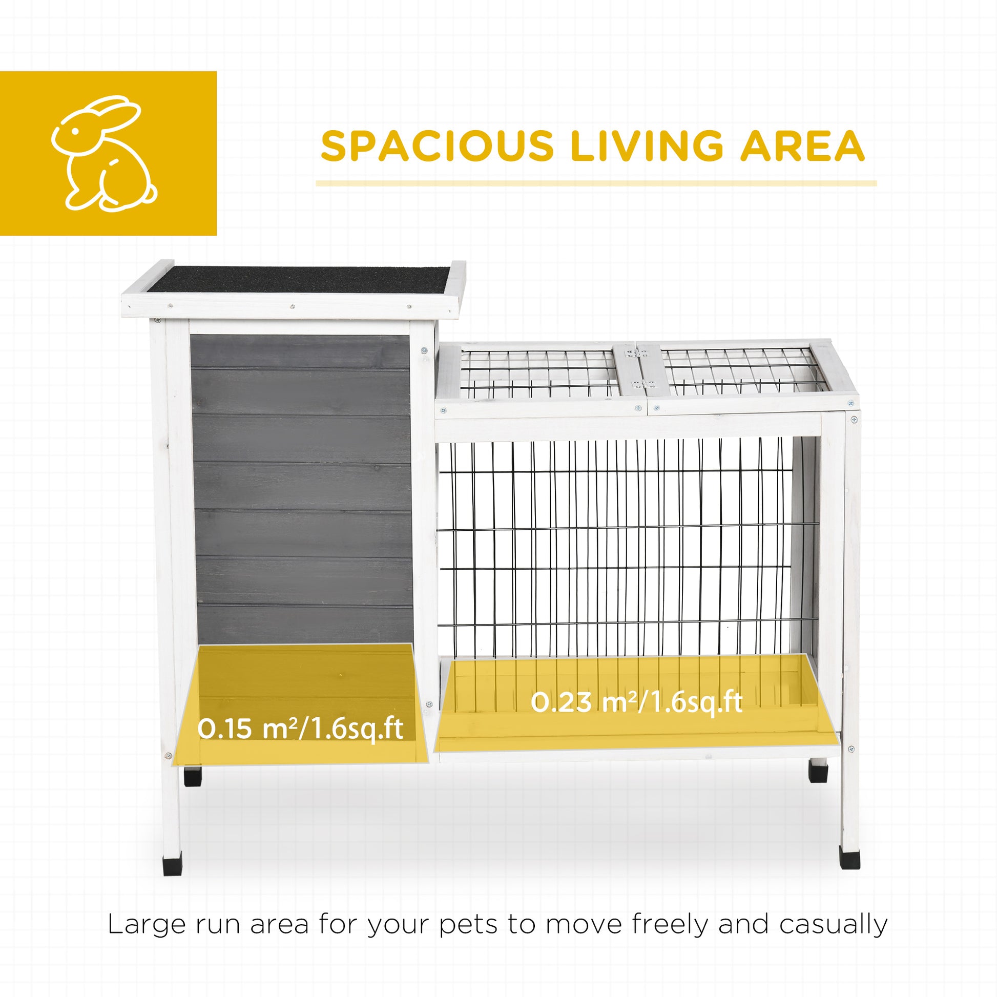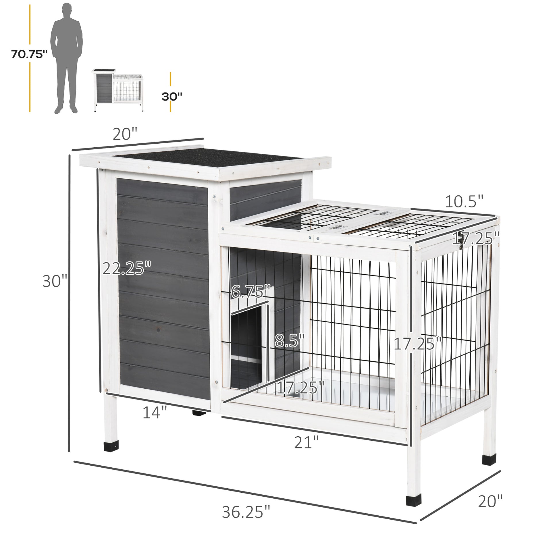 This 36" outdoor rabbit cage from PawHut is perfect for use with rabbits, guinea pigs, and other small animals. This bunny house features sturdy construction from Fir wood coated with a waterbased preservative to ensure longlasting use whether used indoors or outside in the elements. This rabbit starter kit hutch has a sturdy steel wire outdoor run for your pets to run around as well as an enclosed space for them to be able to sleep indoors. The roof opens to gain quick access to your pets and the outdoor living area has a removable pullout tray to make cleaning simple and quick.