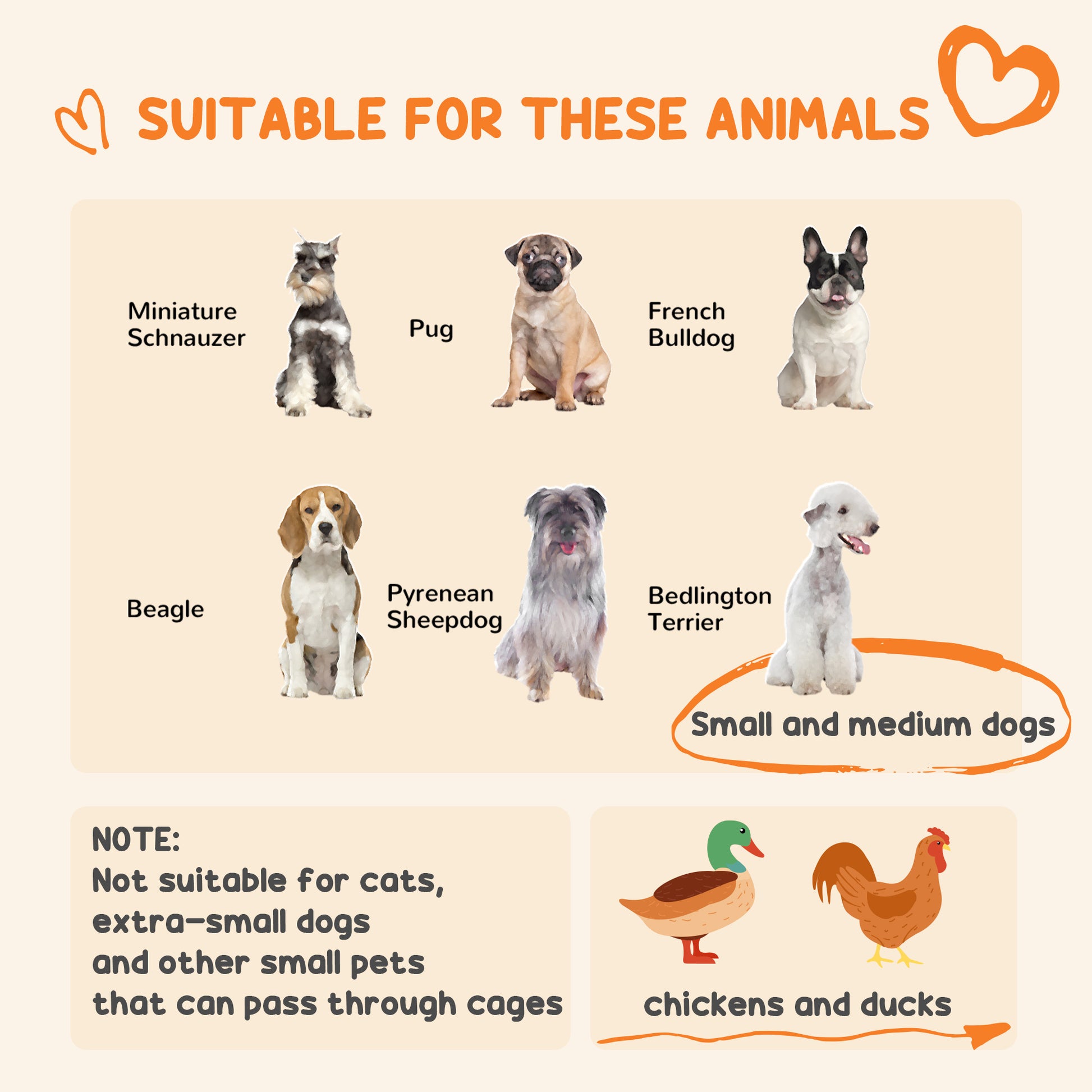 - Suitable for small and medium dogs up to 33lbs, chickens, ducks