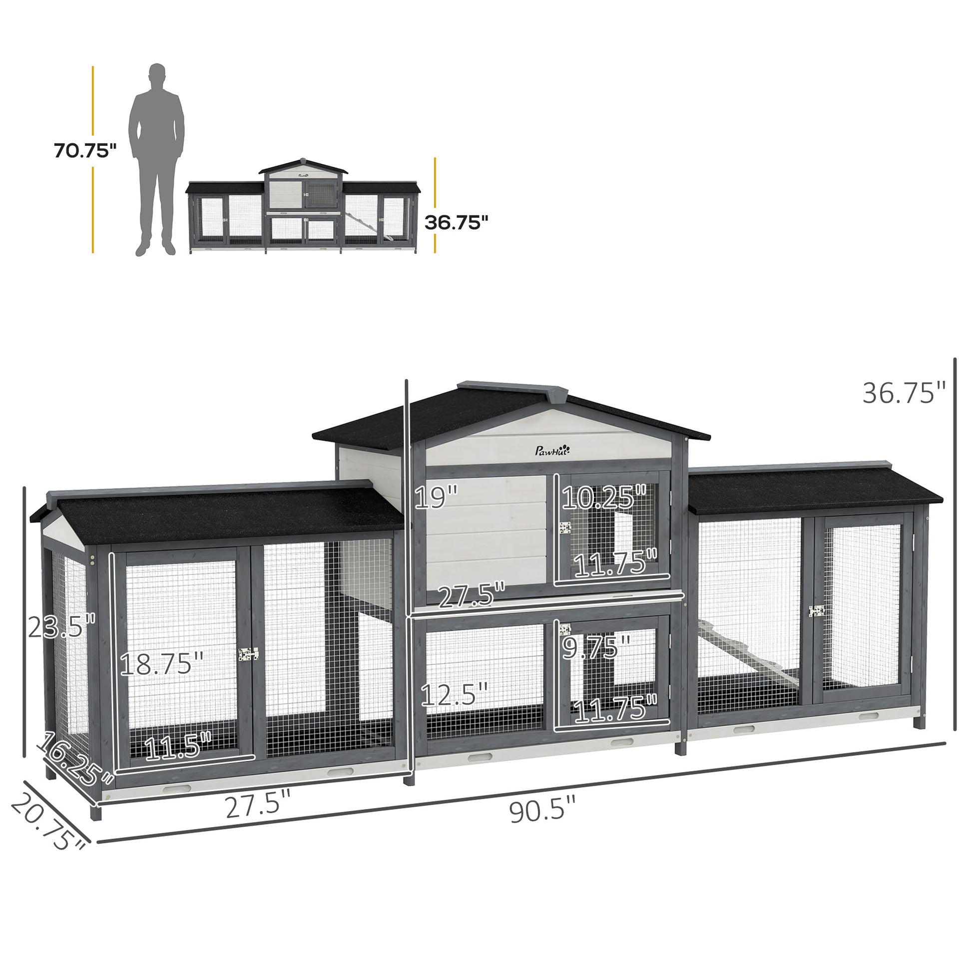 PawHut 90.5" Wooden Rabbit Hutch Bunny Cage Pet Playpen House Enclosure with Double Side Run Boxes, No Leak Tray, Ramp, for Rabbits, Chickens, Ducks, Guinea Pig and Small Animals, Light Gray