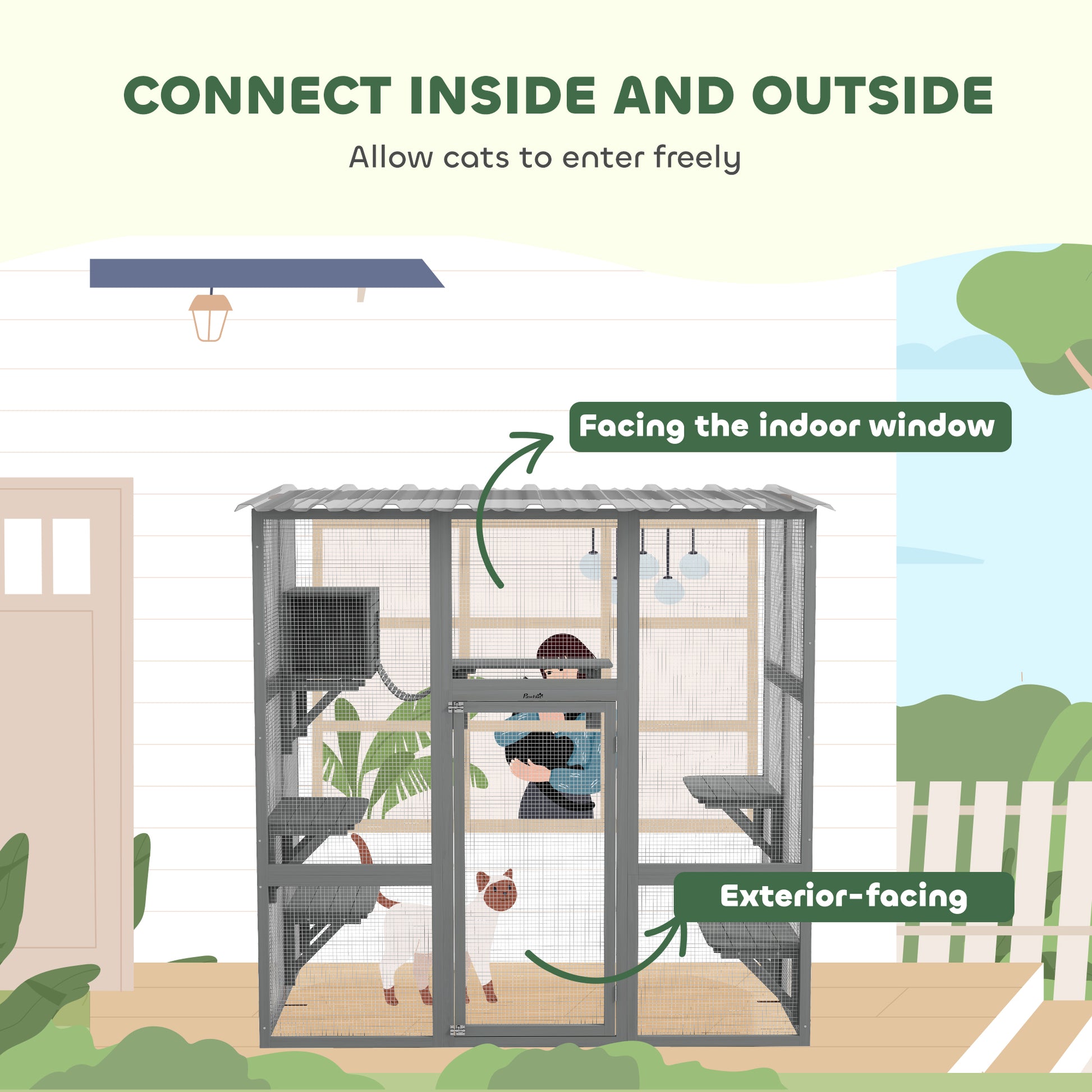 PawHut Catio Outdoor Cat Enclosure, Window Box Wooden Cat House with Bridge Platforms, Gray