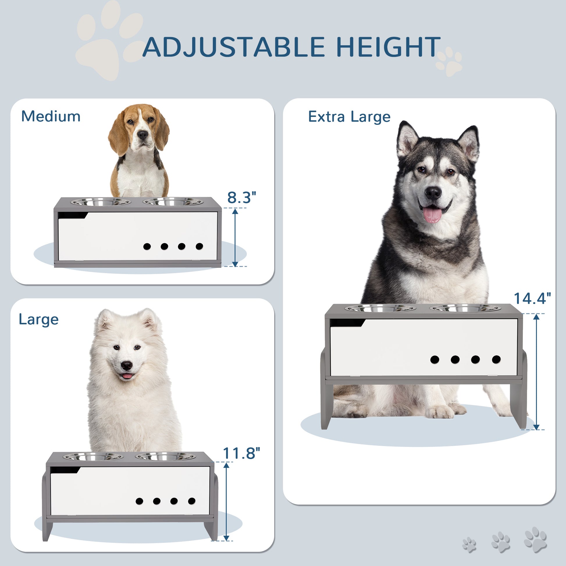 Elevate your pet's dining experience with PawHut's elevated dog bowls! This raised dog bowl design ensures a comfortable eating position, promoting healthier digestion with a slow feeder mat. Customize the height to fit your pup, from medium to extra large, with three adjustable levels. Plus, keep essentials hidden away in the handy storage compartment. Treat your furry friend to this stylish and functional dog feeding station!
