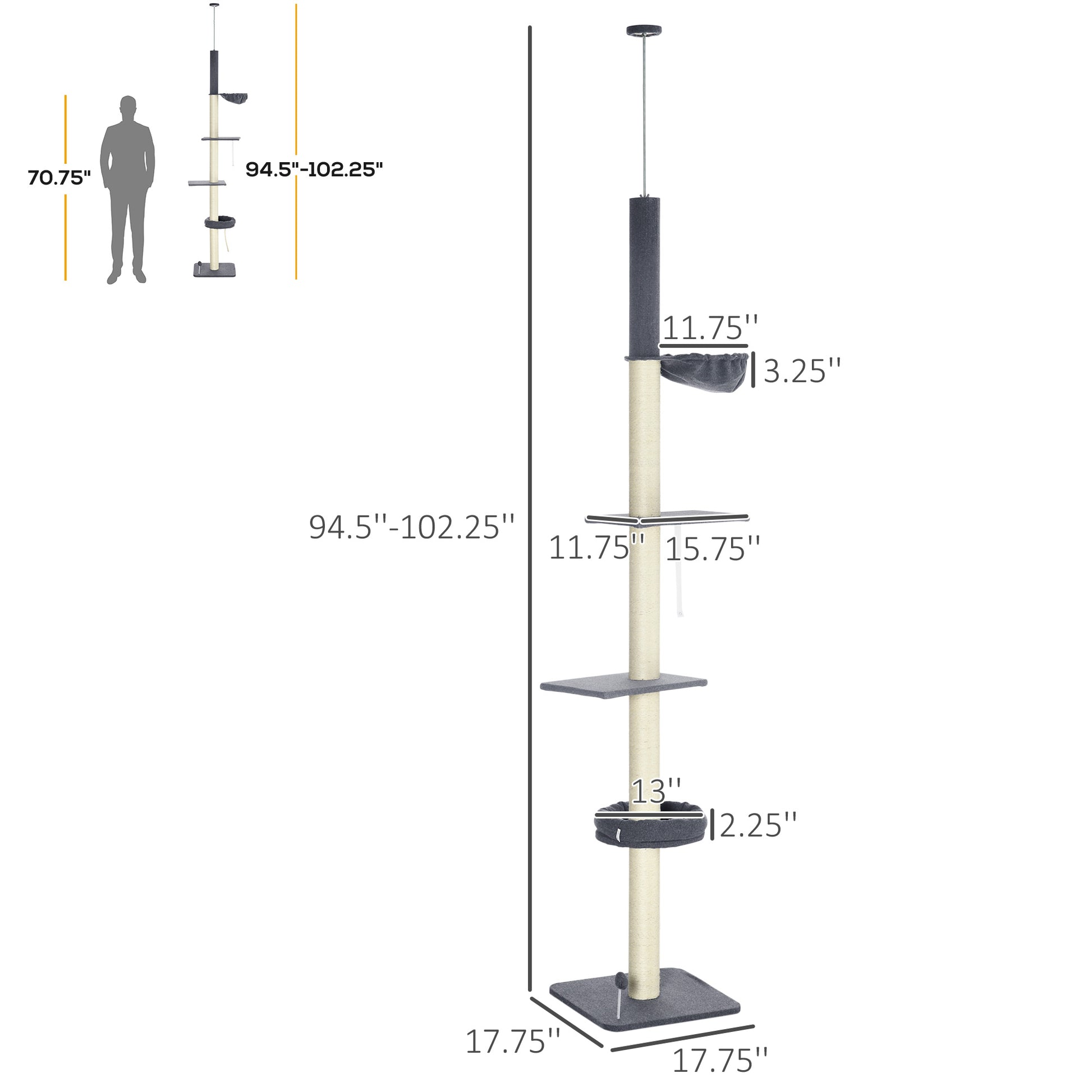 PawHut Floor To Ceiling Cat Tree, 5-Tier Cat Climbing Tower, 95''-106'' Height Adjustable with Carpeted Platforms, Cozy Bed, Hammock, Scratching Post & Toy Ball for Indoor Cats, Dark Gray and Cream