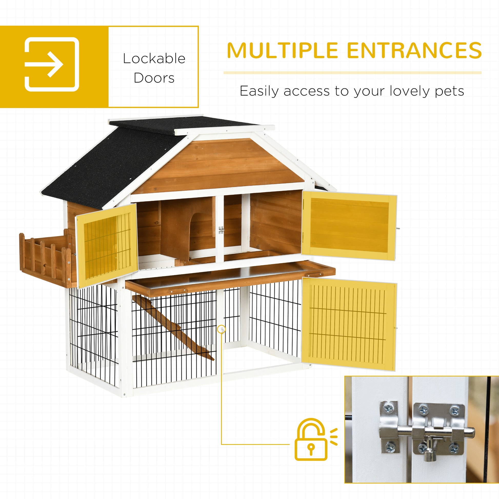 Give your rabbit the freedom they deserve with this rabbit house from PawHut. Featuring a main living area and a run area, your rabbits will have plenty of room to roam and relax. With easy access doors, cleaning and caring for your rabbits becomes a breeze. The cozy sheltered area with its roof offers protection from the elements, keeping them dry and comfortable in the bunny house. Provide them with a safe and comfortable haven to thrive and play.