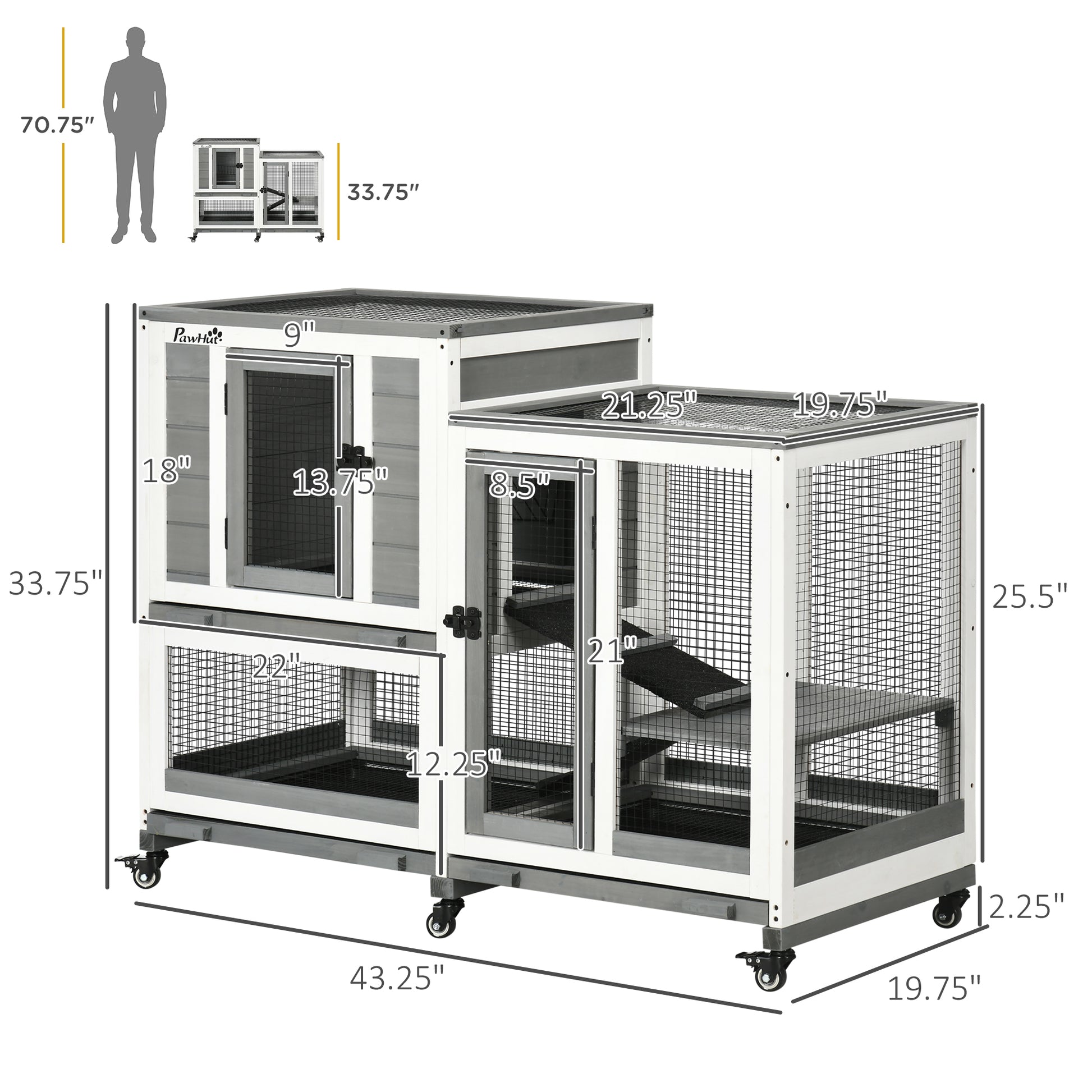 PawHut's bunny hutch offers an excellent combination of comfort and space, effortlessly blending into any living area. Heavy lifting isn't necessary; this rabbit house has wheels for easy movement. Crafted from solid fir wood, this bunny cage ensures reliable daily use. It features a steelwired running area and an enclosed sleeping space with ramps for easy access. Additionally, three removable trays simplify cleaning.