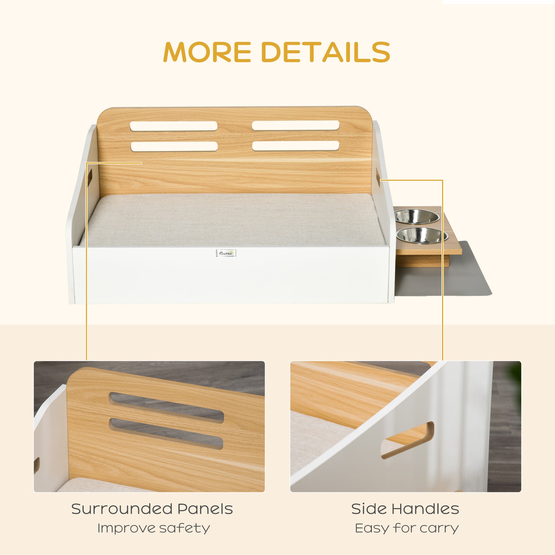 PawHut Wooden Dog Bed, Furniture Style Pet Couch, Cat Sofa with Soft Cushion, Backrest, 2 Feeding Bowls, Handles, for Small and Medium Sized Dog