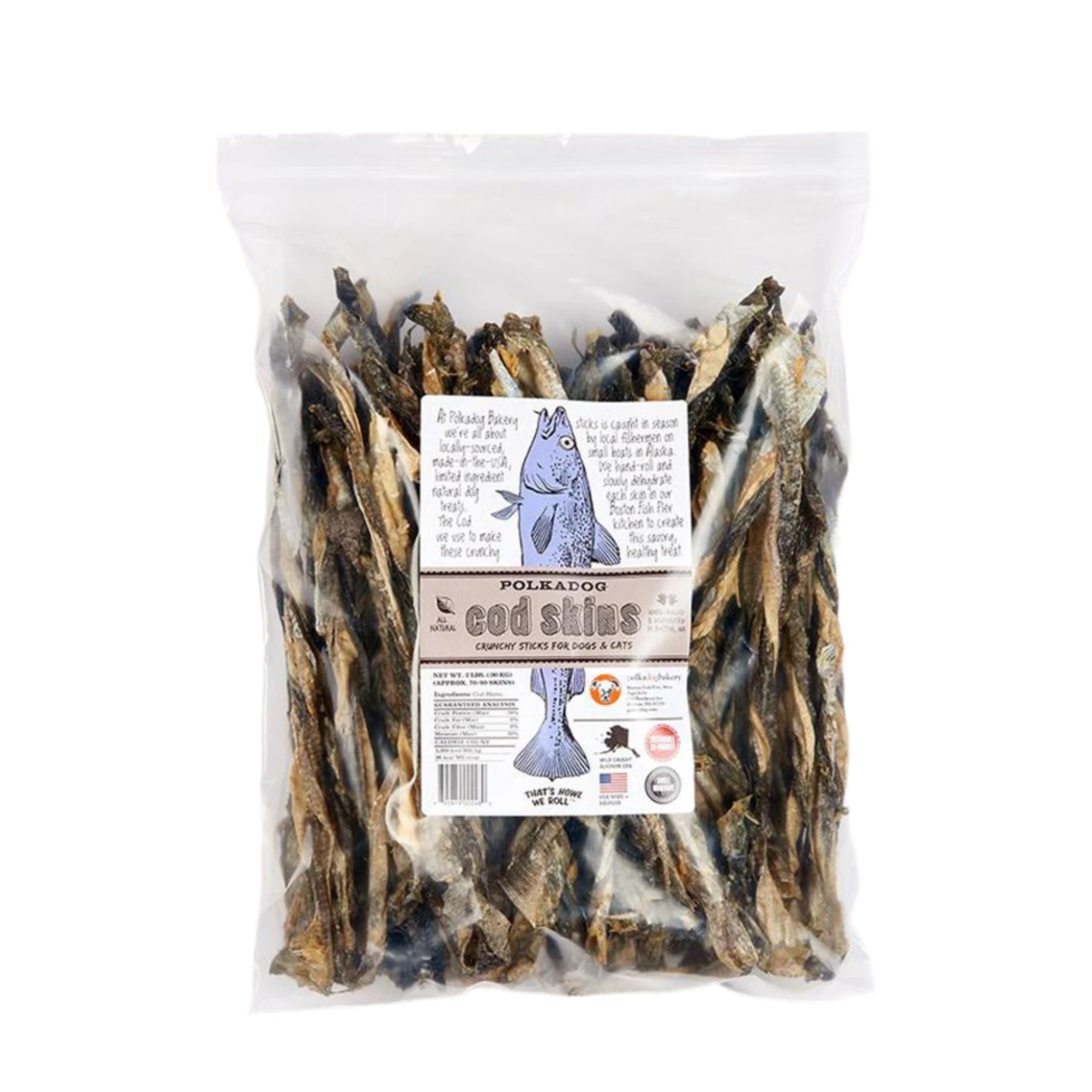 At Polkadog, we're all about locally sourced, made-in-the-USA, limited ingredient natural dog treats. Our super-duper fish skin dog treats are no exception. The cod we use to make these cod skins for dogs is caught wild in season by fishermen on small boats in Alaska. We hand-roll and slowly dehydrate each skin in our Boston kitchen to create these crunchy, savory, healthy cod skin treats.