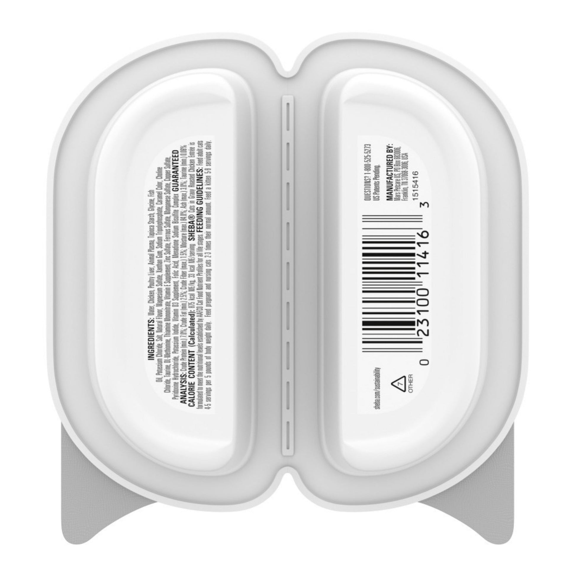 Two single servings of cuts of roasted chicken recipe in delicious gravy for a fresh meal every time. THE ULTIMATE EXPERIENCE FOR CATSSHEBA PERFECT PORTIONS Cuts in Gravy cat food serves up a dinnertime delight with a full line of meaty entre s prepared in a savory gravy that will leave them purring for more. Give your favorite feline a fresh and delectable entr e every meal. No mess. No fuss. ingredients:Water, Chicken, Poultry Liver, Animal Plasma, Tapioca Starch, Glycine, Fish Oil, Potassium Chloride, Salt, Natural Flavor, Magnesium Sulfate, Xanthan Gum, Sodium Tripolyphosphate, Caramel Color, Choline Chloride, Taurine, DL-Methionine, Thiamine Mononitrate, Vitamin E Supplement, Zinc Sulfate, Ferrous Sulfate, Manganese Sulfate, Copper Sulfate, Pyridoxine Hydrochloride, Potassium Iodide, Vitamin D3 Supplement, Folic Acid, Menadione Sodium Bisulfite ComplexGuaranteed Analysis:Crude Protein, Min. 7.0%Crude Fat, Min. 2.5%Crude Fiber, Max. 1.5%Moisture, Max. 84.0%Ash, Max. 3.0%Taurine, Min. 0.06%Calorie Content (Calculated): 875 kcal ME/kg, 33 kcal ME/servingFeeding Guidelines:Feed adult cats 4-5 servings per 5 pounds of body weight daily. Feed pregnant and nursing cats 2-3 times their normal amount. Feed a kitten 5-9 servings daily.