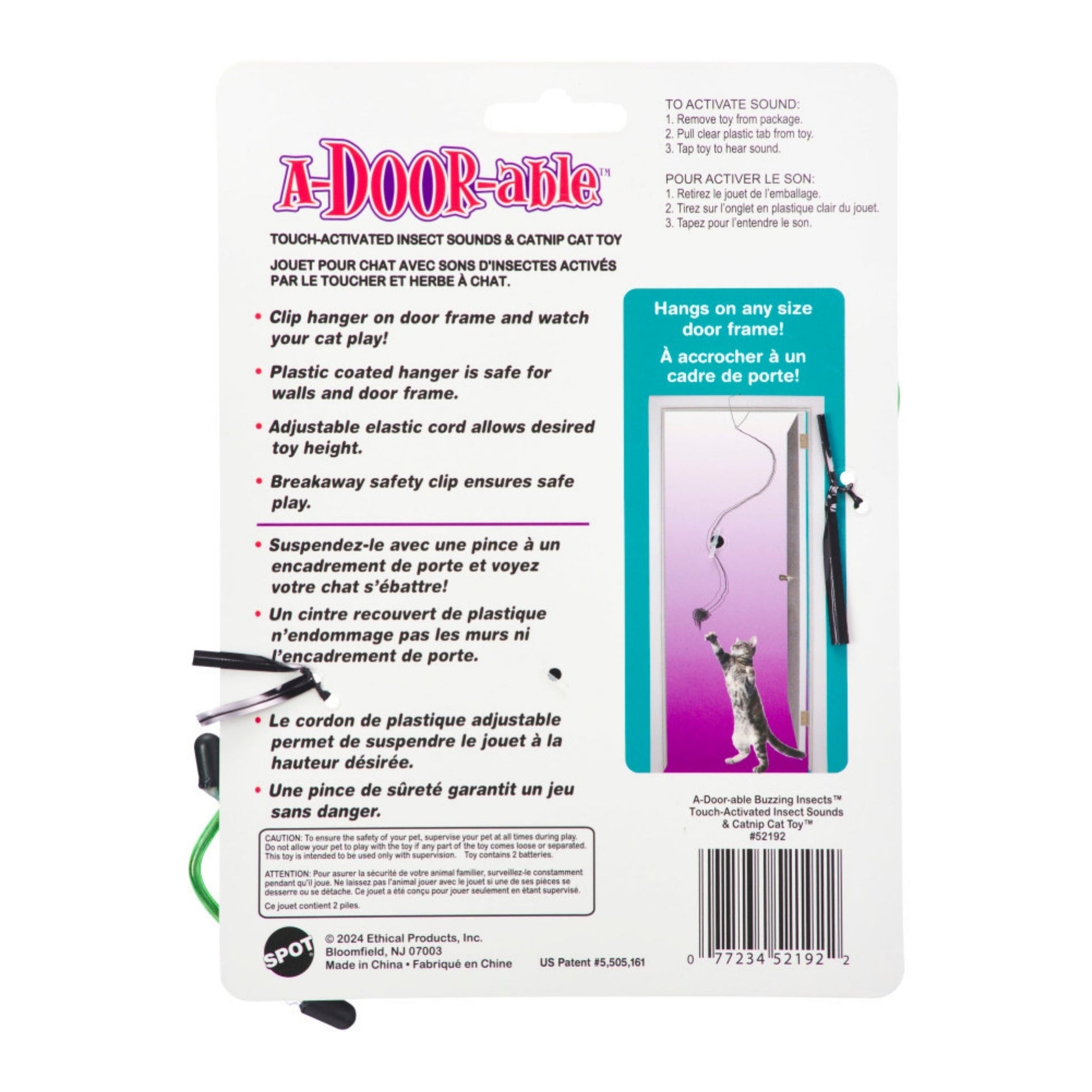 A-Door-Able Buzzing Insects is a touch activated catnip toy with realistic insect sounds. Easily attaches to any door frame with a plastic coated hanger that is safe for walls and door frames. Adjustable elastic cord allows you to set the desired toy height. Features a break-away safety clip to ensure a safe play time. Includes a catnip/silver vine blend.