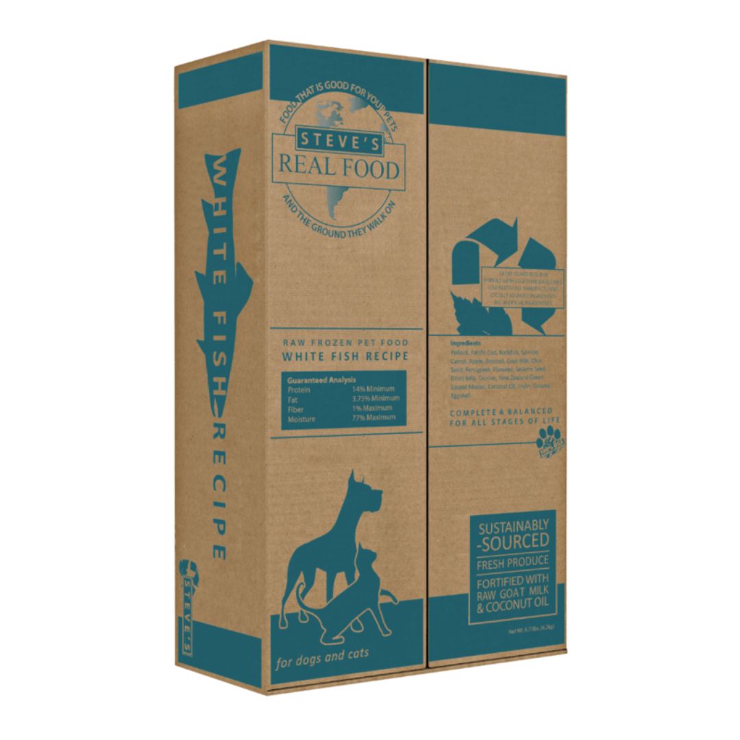 Steve’s Real Food frozen raw white fish recipe is our lowest fat recipe. The fish are sourced from fisheries certified by the Marine Stewardship Council (MSC). MSC is an organization that upholds rigorous standards for sustainable fishing and seafood traceability. Our white fish recipe is complete and balanced for all life stages and species-appropriate for dogs and cats.