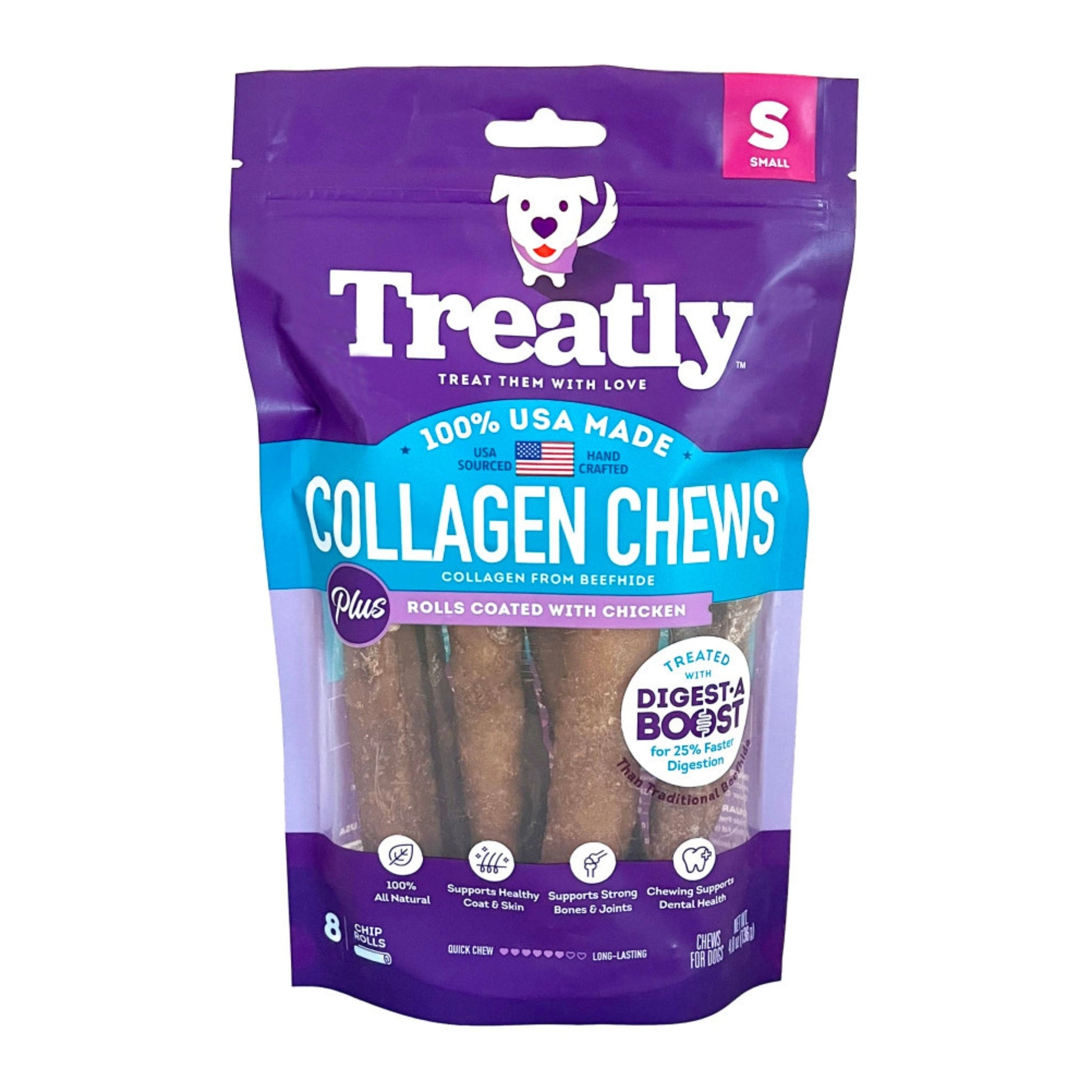 Treatly USA Collagen Chip Rolls Natural Flavor. Treated with Digest-A-Boost for 25% faster digestion. 100% USA Made, Sourced and Hand Crafted. Promote strong bones and joints, strengthens joints and soft tissue. Promotes healthy coat and skin.