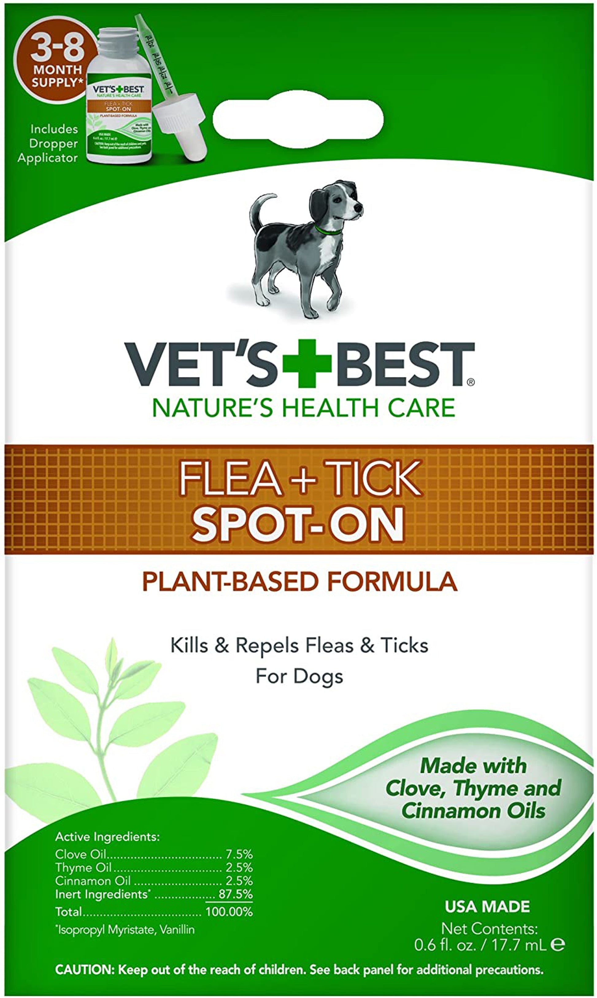 For over 30 years, Vets Best has blended natural that work together to comfort and protect your pet. Vets Best Flea and Tick Spot-On drops for dogs is great for monthly protection from fleas and ticks. Each dose kills and repels fleas and ticks for up to one month. Easy to open, pinch and squeeze tubes can easily be applied between dogs shoulder blades. Made with an unique blend of certified natural oils like clove, thyme and cinnamon oils. One package contains 4 months supply. Made in the USA.