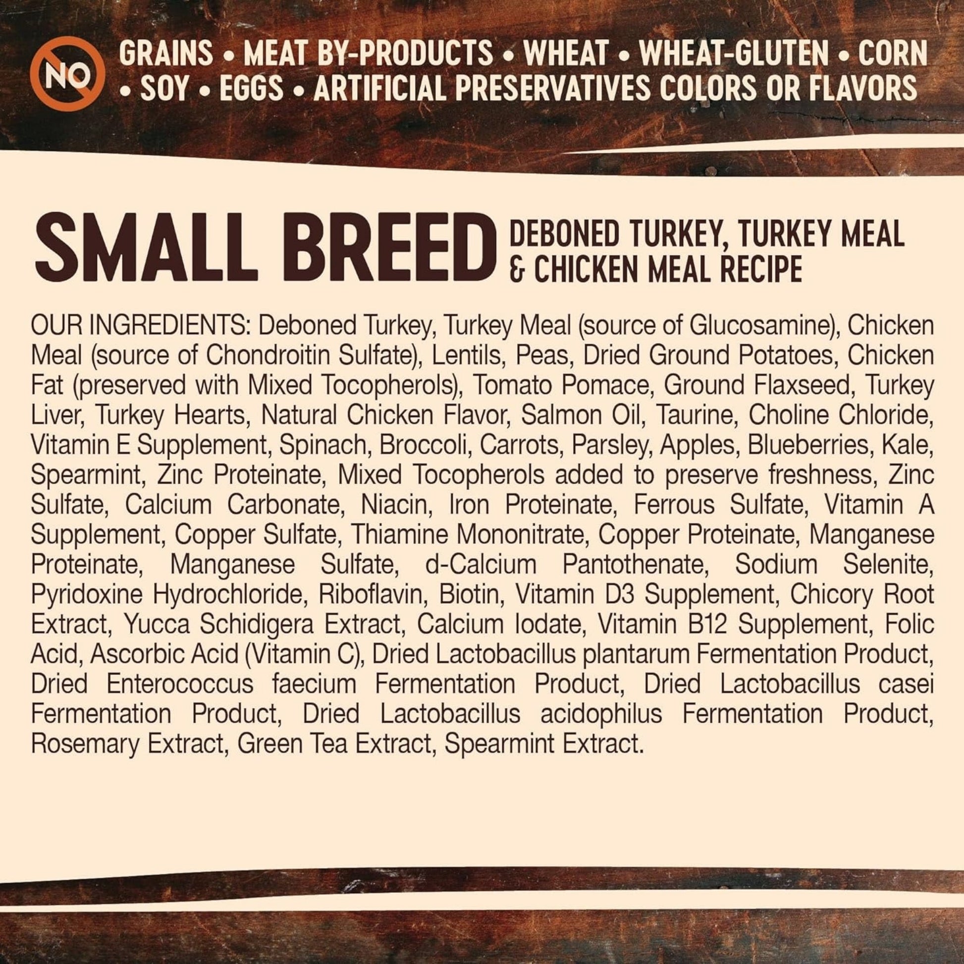 Deboned Turkey, Turkey Meal (source of Glucosamine), Chicken Meal (source of Chondroitin Sulfate), Lentils, Peas, Dried Ground Potatoes, Chicken Fat (preserved with Mixed Tocopherols), Tomato Pomace, Ground Flaxseed, Turkey Liver, Turkey Hearts, Natural Chicken Flavor, Salmon Oil, Taurine, Choline Chloride, Vitamin E Supplement, Spinach, Broccoli, Carrots, Parsley, Apples, Blueberries, Kale, Spearmint, Zinc Proteinate, Mixed Tocopherols added to preserve freshness, Zinc Sulfate, Calcium Carbonate, Niacin, Iron Proteinate, Ferrous Sulfate, Vitamin A Supplement, Copper Sulfate, Thiamine Mononitrate, Copper Proteinate, Manganese Proteinate, Manganese Sulfate, d-Calcium Pantothenate, Sodium Selenite, Pyridoxine Hydrochloride, Riboflavin, Biotin, Vitamin D3 Supplement, Chicory Root Extract, Yucca Schidigera Extract, Calcium Iodate, Vitamin B12 Supplement, Folic Acid, Ascorbic Acid (Vitamin C), Dried Lactobacillus plantarum Fermentation Product, Dried Enterococcus faecium Fermentation Product, Dried Lactobacillus casei Fermentation Product, Dried Lactobacillus acidophilus Fermentation Product, Rosemary Extract, Green Tea Extract, Spearmint Extract.